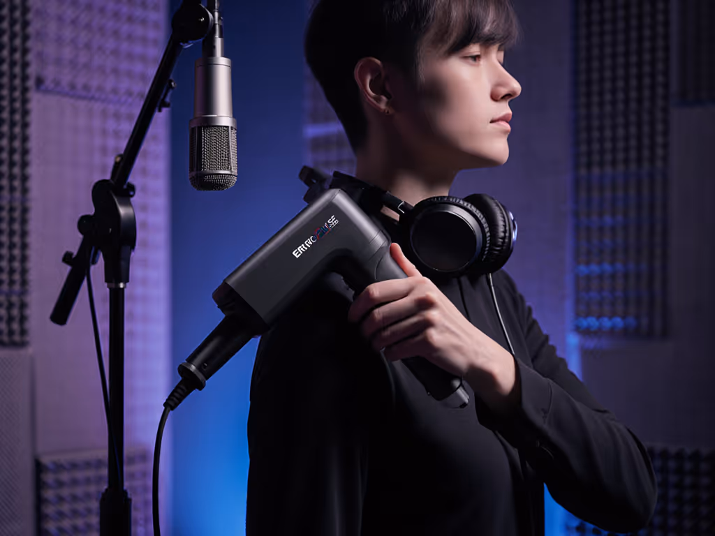 Vocalists need solutions that fit between takes. Massage guns deliver staged relief in under 10 minutes: 2 minutes per shoulder, 1 minute on suboccipitals (back of skull). Traditional massage requires 30+ minutes for comparable results, which is impossible before a gig. Deskbound podcasters thrive with discreet gun use during coffee breaks; one client reduces "tech neck" strain in 7 minutes flat using Therabody's guided neck routine.